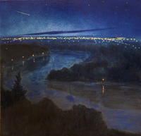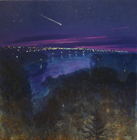 He is well-known for his nocturnal views of the city, in which familiar locations like snow-covered parks and residential back alleys are imbued with an ominous mood and eerie unease through dramatic plays of light and shadow. Recently, Rawlinson’s paintings have turned towards a figurative presence in the landscape, inspired by a recent close encounter with a moose. Rawlinson casts the iconic Canadian symbol as an actor in his ambiguous narratives, a curious wanderer in an unfamiliar place. Curriculum Vitae