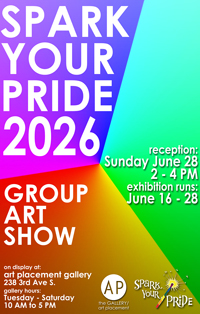| SPARK YOUR PRIDE Reception: Sunday June 28, 2 - 4 PM June 16 - 28 >> click here for more information Art Placement is pleased to once again partner with Spark Your Pride to present a group exhibition of LGBTQIA2S+ artists from the Saskatoon community during Pride Week. The exhibition offers a glimpse at the diversity of work produced by LGBTQIA2S+ artists in the city.